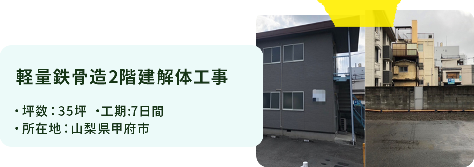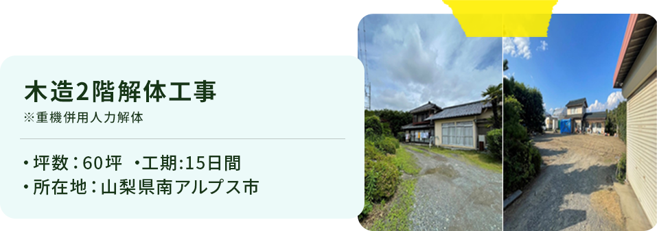| サービス内容 | ■解体工事 ■住宅解体工事 ■工場・店舗等の解体工事 ■マンションやビル等の解体工事 ■内装解体工事 ■外構撤去工事・小規模解体工事 ■アスベスト調査・除去工事 ■残置物撤去工事 ■解体工事後の整地 ■産業廃棄物収集・運搬 ■フロンガス改修工事 |